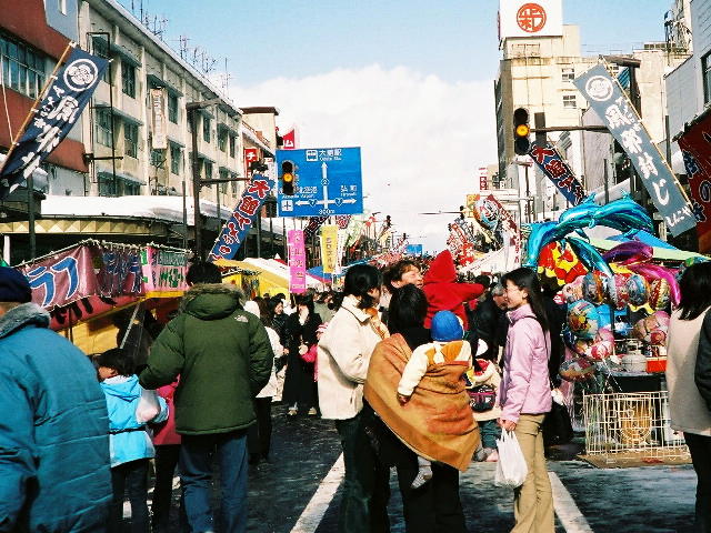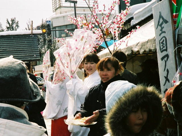 昔から市で売られているアメを食べると風邪をひかないと言われており近郊から買いきているそうです。 今年は雪が多いとのこと。アメッコ市は吹雪くといわれていますが、 今年も時折雪の降るアメッコ市になりました。2月12日(土)〜13日(日)開催